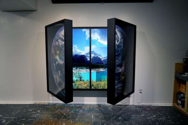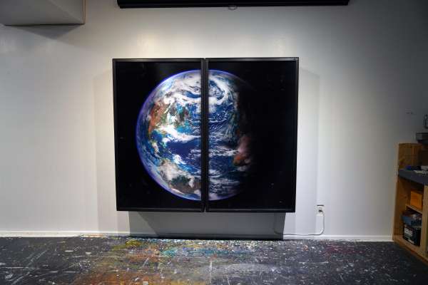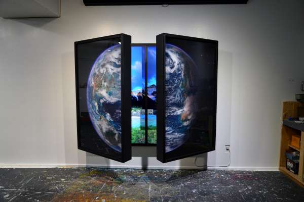 Physically, the work manifests as an interactive “altarpiece” fashioned after Bosch’s renaissance masterwork ‘THE GARDEN OF EARTHLY DELIGHTS’. The side panels of the triptych are hinged and open like cupboard doors. When the doors of CODEX RUNDLE are closed, viewers are presented with a 3D lenticular image of the Earth as viewed from outer space. Opening the panels initiates a “zoom” from the celestial to the terrestrial.